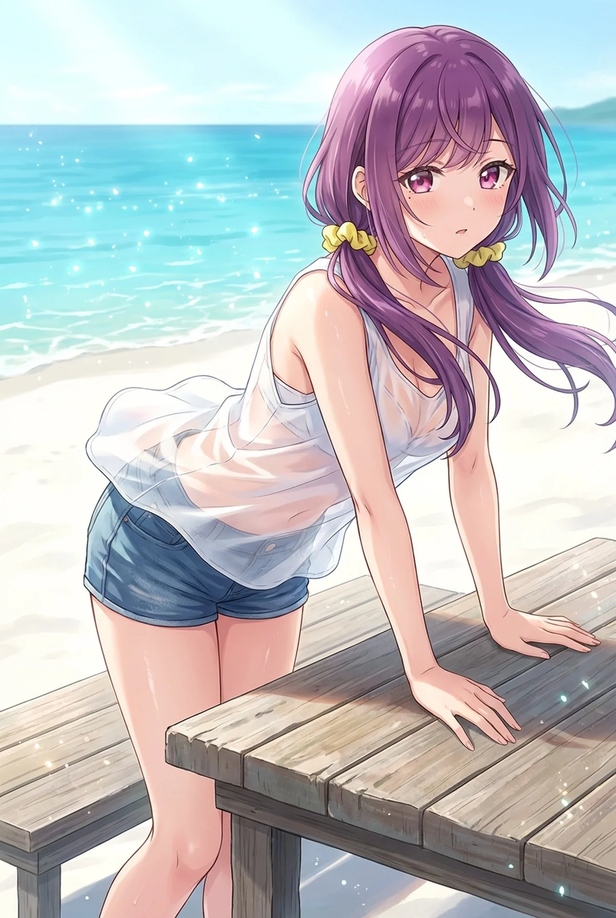 双見奈々が夏のきらめくビーチで木製のテーブルに寄りかかっています。水に濡れた白いタンクトップが透けて見え、デニムのショートパンツ姿で、涼しげな夏のワンシーンを描写しています。