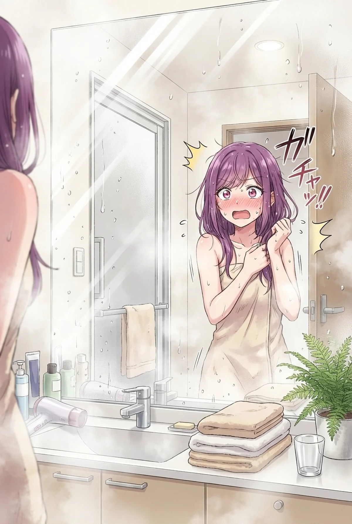 双見奈々が湯気で曇った鏡の前に立つ入浴後のひととき。突然の物音に驚き、顔を赤らめる彼女のキュートな表情が印象的です。「笑顔のたえない職場です。」の世界観が垣間見えます。