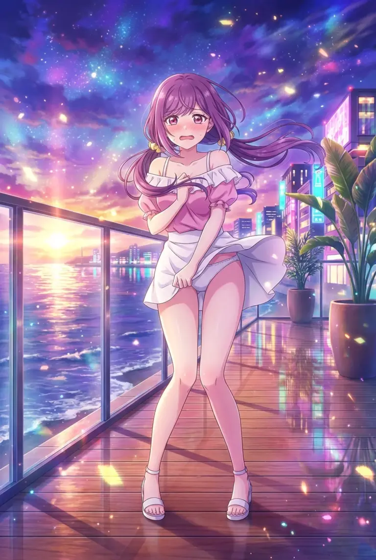 双見奈々が夕焼けと星空が広がるバルコニ…